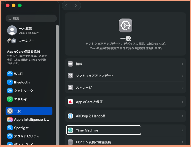 ・【システム設定】>【 一般】>【Time Machine】をクリックします。