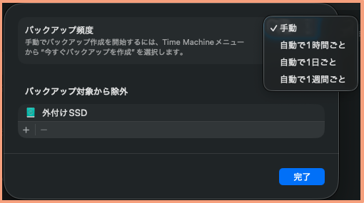 「1時間ごと」「1日ごと」「1週間ごと」「手動」から選択できます。