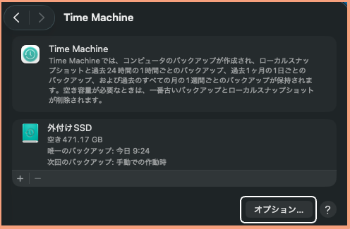 Time Machine設定画面 の「オプション」をクリックすると、バックアップの頻度とバックアップの対象の設定ができます。
