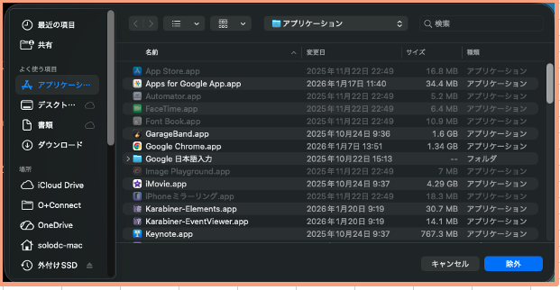 「+」をクリックすると、バックアップから除外するファイル等を選択できます。