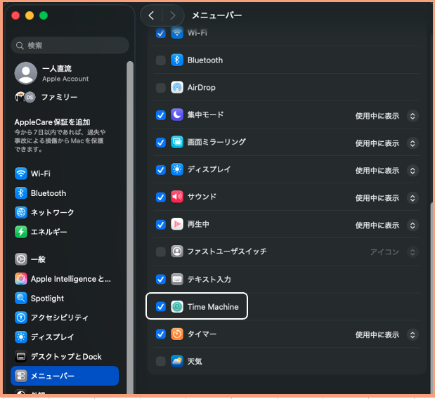 【システム設定】>【メニューバー】>「Time Machine」にチェックを入れます。