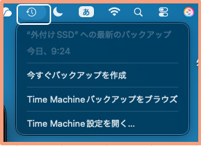 これで、【メニューバー】にアイコンが表示されます。クリックして、「今すぐバックアップを作成」をクリックすると、すぐにバックアップが開始できます。