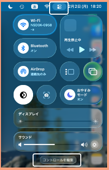 ・メニューバー右上のコントロールセンターアイコン(二つのトグルアイコン)をクリックして、パネルの一番下にある 「コントロールを編集」をクリックして、編集モードにします。