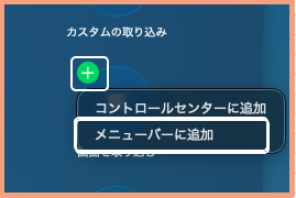 ・「カスタムの取り込み」「画面を取り込む」「選択部分を取り込む」にフォーカスして「+」をクリックして、「メニューバーに追加」をクリックします。